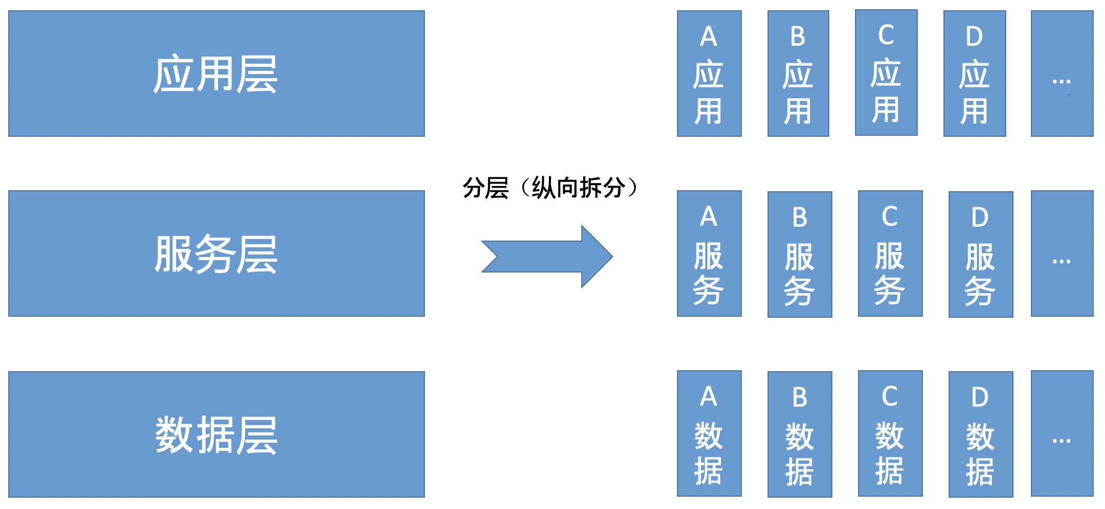 分层简单来看可以分为三层,应用层、服务层、数据层。