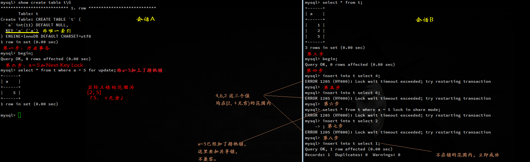 t中共有1、2、5 三个值。会话A中首先对a=5进行锁定,由于a是主键,主键都是唯一的。因此就从Next-Key Lock 降级为Record Lock,仅锁定5这个值。而不是范围(2, 5] (5, +∞),因此插入4这个值非阻塞。